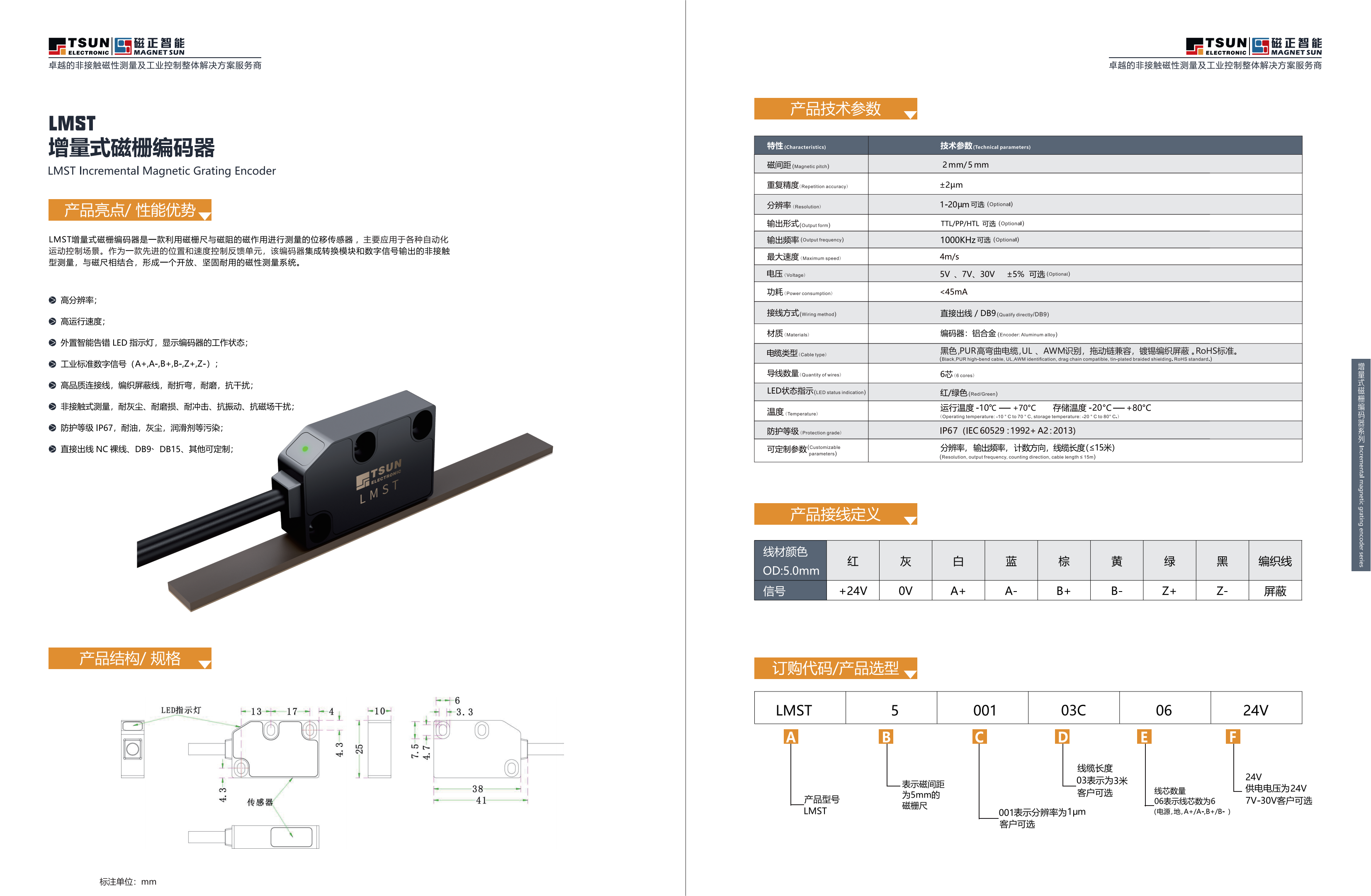 LMST增量式磁栅编码器是一款利用磁栅尺与磁阻的磁作用进行测量的位移传感器 ,主要应用于各种自动化 运动控制场景。作为一款先进的位置和速度控制反馈单元,该编码器集成转换模块和数字信号输出的非接触 型测量,与磁尺相结合,形成一个开放、坚固耐用的磁性测量系统。