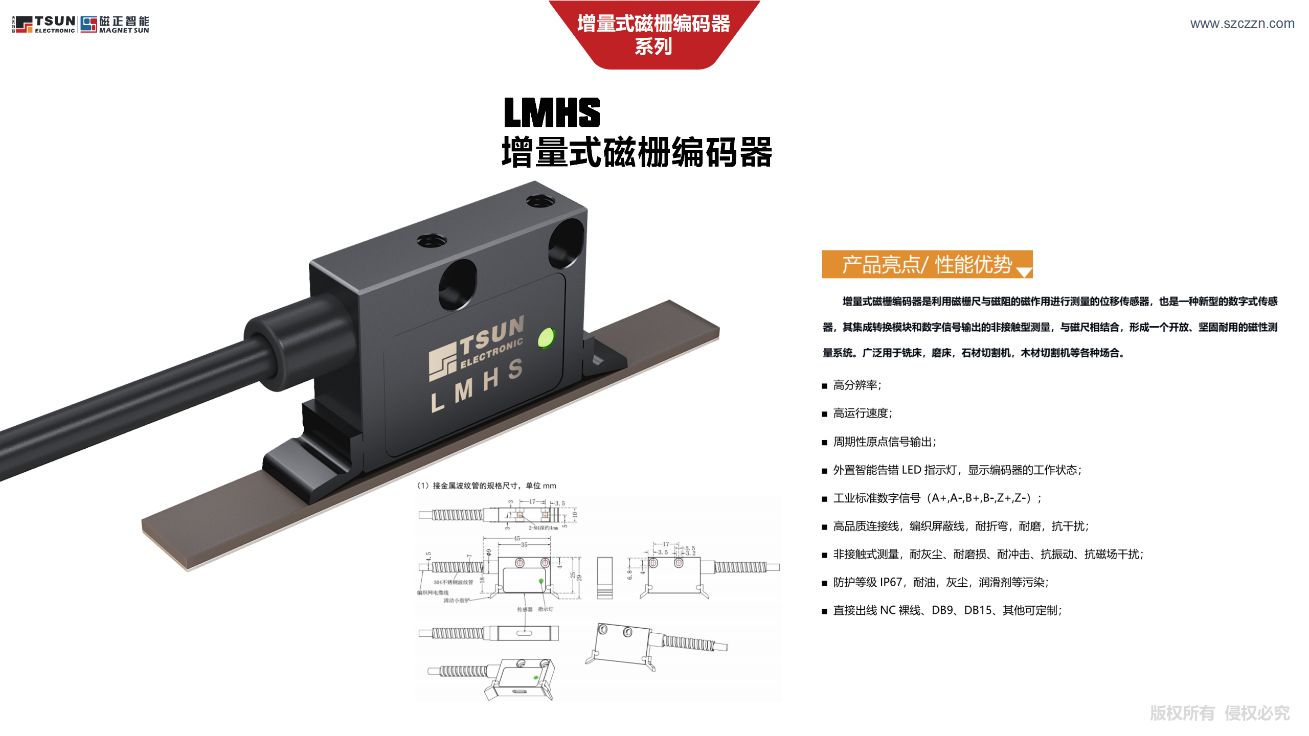 供电电压:5V或5-30V,±5%(可选)。空载电流:5V:小于60mA。信号特征:90°相位差方波。输出方式:TTL/PP/HTL(可选)。耐电压:500VAC(50/60Hz,时间1分钟,端子与外壳之间)。接线方式:直接出线、DB9、DB15、其他;客户可选。磁间距:5mm或2mm(可选)。