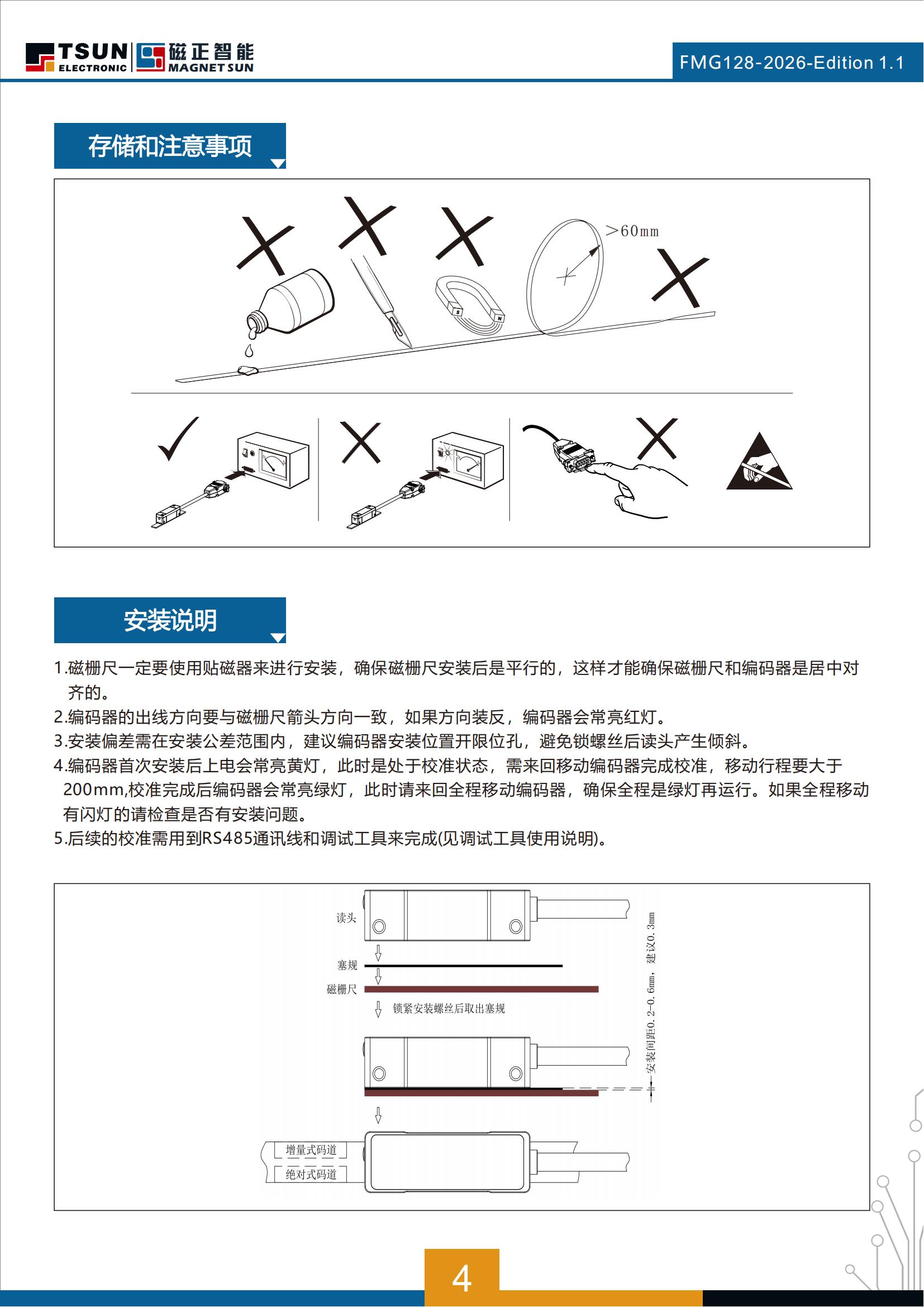 磁栅尺是由2mm极距构成的增量码道和二进制编码构成的绝对值编码码道组成。因此,在安装使用过程中,与编码器之间是需要匹配方向的。编码器以较低的延迟和较短的响应时间,将绝对位置信息通过选定的通信协议传输出去。