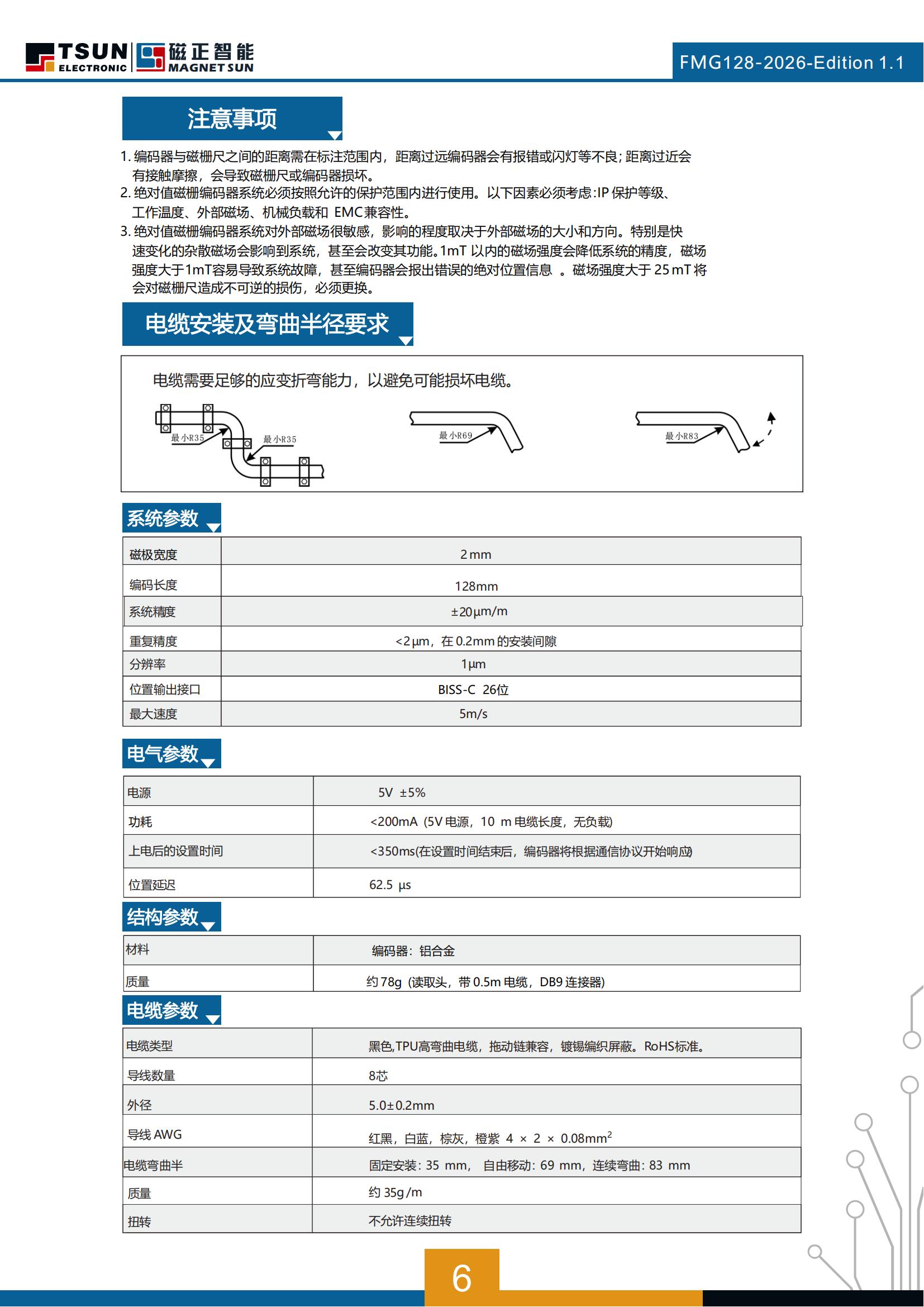 电源5V±5%功耗<200mA(5V电源,10 m电缆长度,无负载)上电后的设置时间<350ms(在设置时间结束后,编码器将根据通信协议开始响应位置延迟62.5 μs